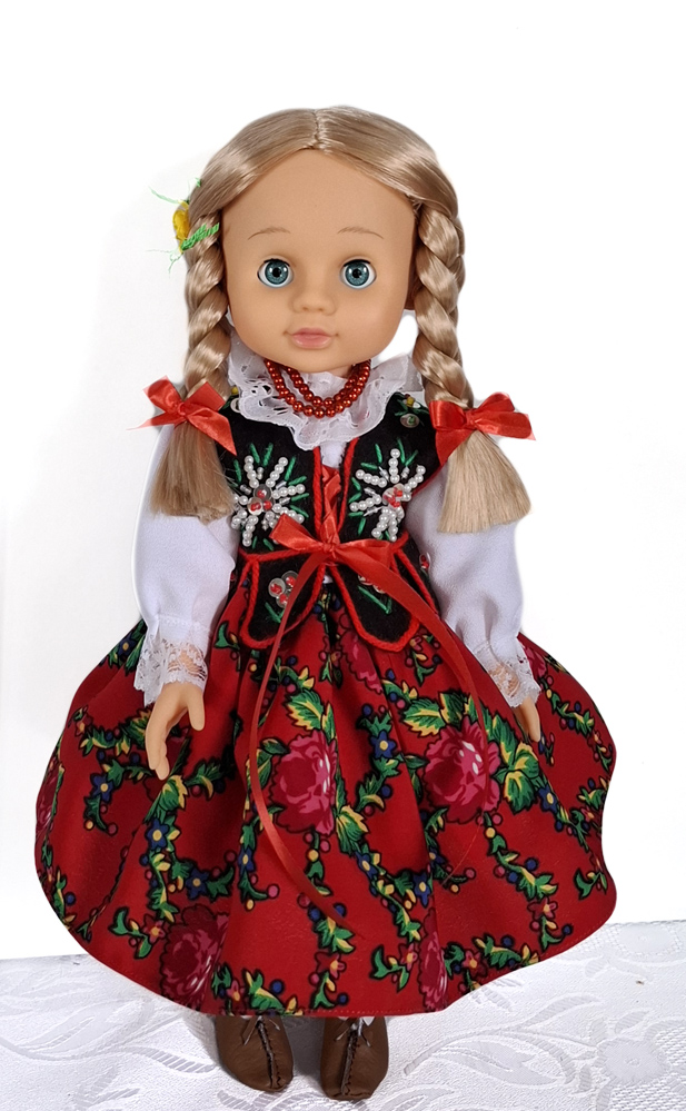 strój kobiecy (panna): tybetowa czerwona kwiecista spódnica, tiulowy fartuszek, biała bluzka ...